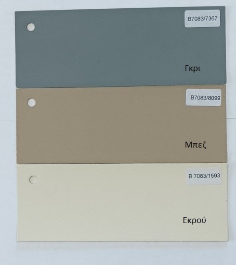 Το υλικό που χρησιμοποιούμε είναι μουσαμάς βαρέως τύπου 650 gr/m2 με μεγάλη αντοχή στο χρόνο, διαθέσιμο σε τρία χρώματα: γκρι ανοιχτό , γκρι σκούρο και εκρού και ράβονται κατά παραγγελία στα μέτρα των επίπλων σας.